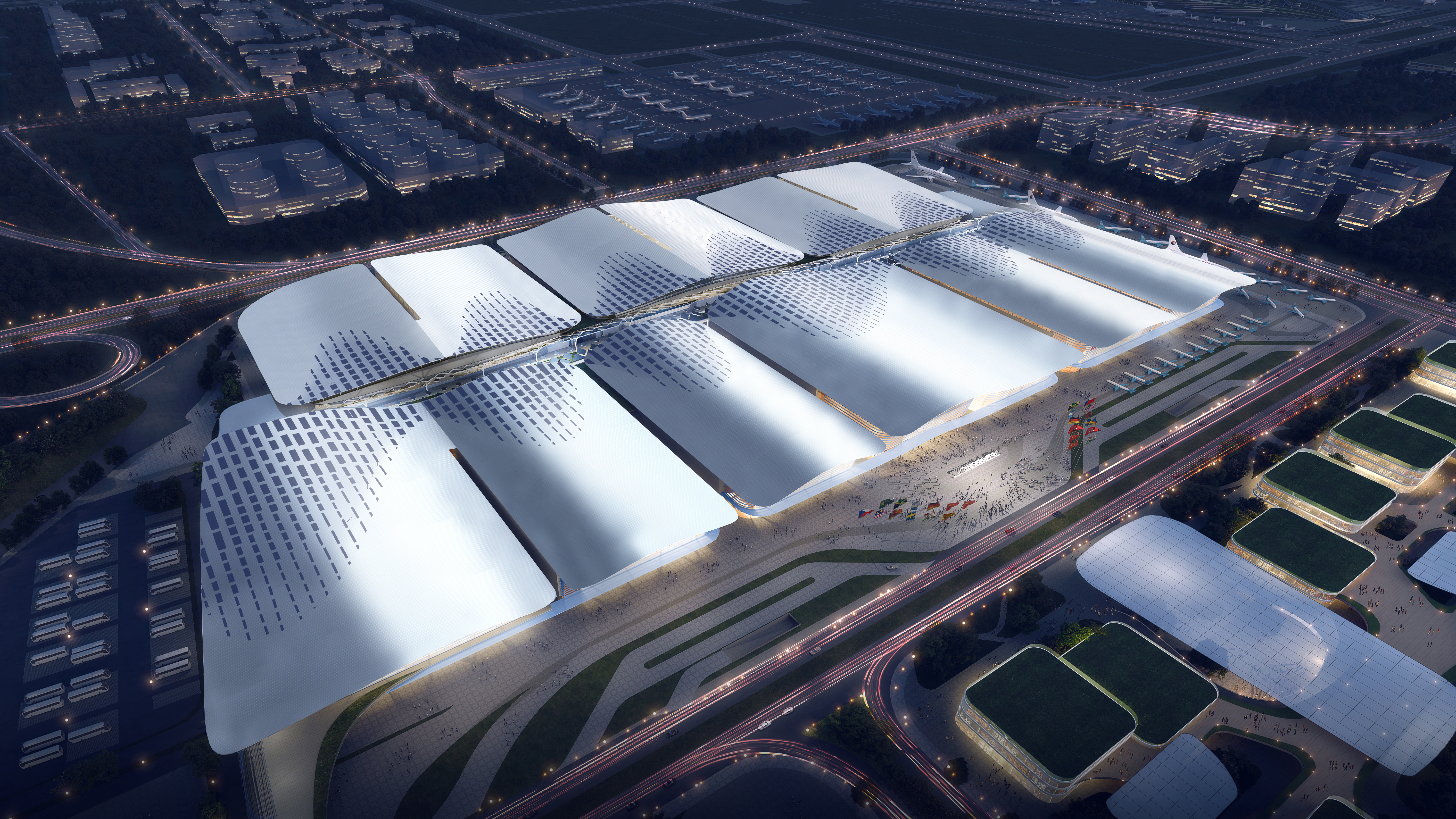 該項目建設(shè)整體鋼結(jié)構(gòu)用量達(dá)1.4萬噸,鋼結(jié)構(gòu)安裝是項目重難點之一,也是實現(xiàn)高品質(zhì)履約的重要環(huán)節(jié)。特別是在標(biāo)準(zhǔn)展館屋蓋吊裝過程中,由于采用的梭形復(fù)合張弦桁架結(jié)構(gòu)是一種新型的空間結(jié)構(gòu)受力形式,在相關(guān)項目上的運用較少,給項目施工帶來了不小挑戰(zhàn)。為此,項目黨支部成立了由項目總工和技術(shù)骨干組成的黨員科技攻關(guān)突擊隊,與業(yè)主及設(shè)計院、西南大學(xué)等科研院所緊密合作,通過模型試驗與有限元分析,完成預(yù)應(yīng)力施工工藝、結(jié)構(gòu)靜動力特性和結(jié)構(gòu)滯回性能的試驗研究,順利解決了空間姿態(tài)定位、預(yù)應(yīng)力張拉、大跨度吊裝等施工難題,并且在吊裝過程中應(yīng)用BIM逆向模擬與北斗高精度定位技術(shù),實現(xiàn)毫米級就位精度,用時較傳統(tǒng)分段吊裝工藝縮短28天,最終順利完成標(biāo)準(zhǔn)展館屋蓋吊裝作業(yè),將施工困局轉(zhuǎn)化為創(chuàng)新破局。